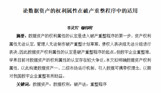 我校厂长资源 22级法律(非法学)硕士研究生李灵芳积极投稿《论数据资产的权利属性在破产重整程序中的适用》并由中国商业法研究会2023年年会论文集全集收录。文章重点阐述了数据资产的财产属性、人身属性对数字企业进入破产重整程序后的影响以及学界目前对数据资产权利属性认定存在的较大争议,文章拟明确数据资产权利属性,提出基础构建数据资产一、二级市场运行机制,引入数据可携带权理念,以期通过对法学理论在实践中的应用研究,对我国数字企业重整有所助益。