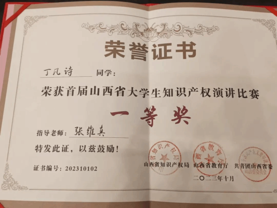 厂长资源 2022级法学二班的丁凡诗同学代表我校参赛,经过层层选拔和激烈角逐,荣获山西省首届大学生知识产权演讲比赛一等奖,其指导老师张维珍获指导教师一等奖。这充分展现了厂长资源 青年的新风采,为宣传知识产权保护工作注入了新动能。
