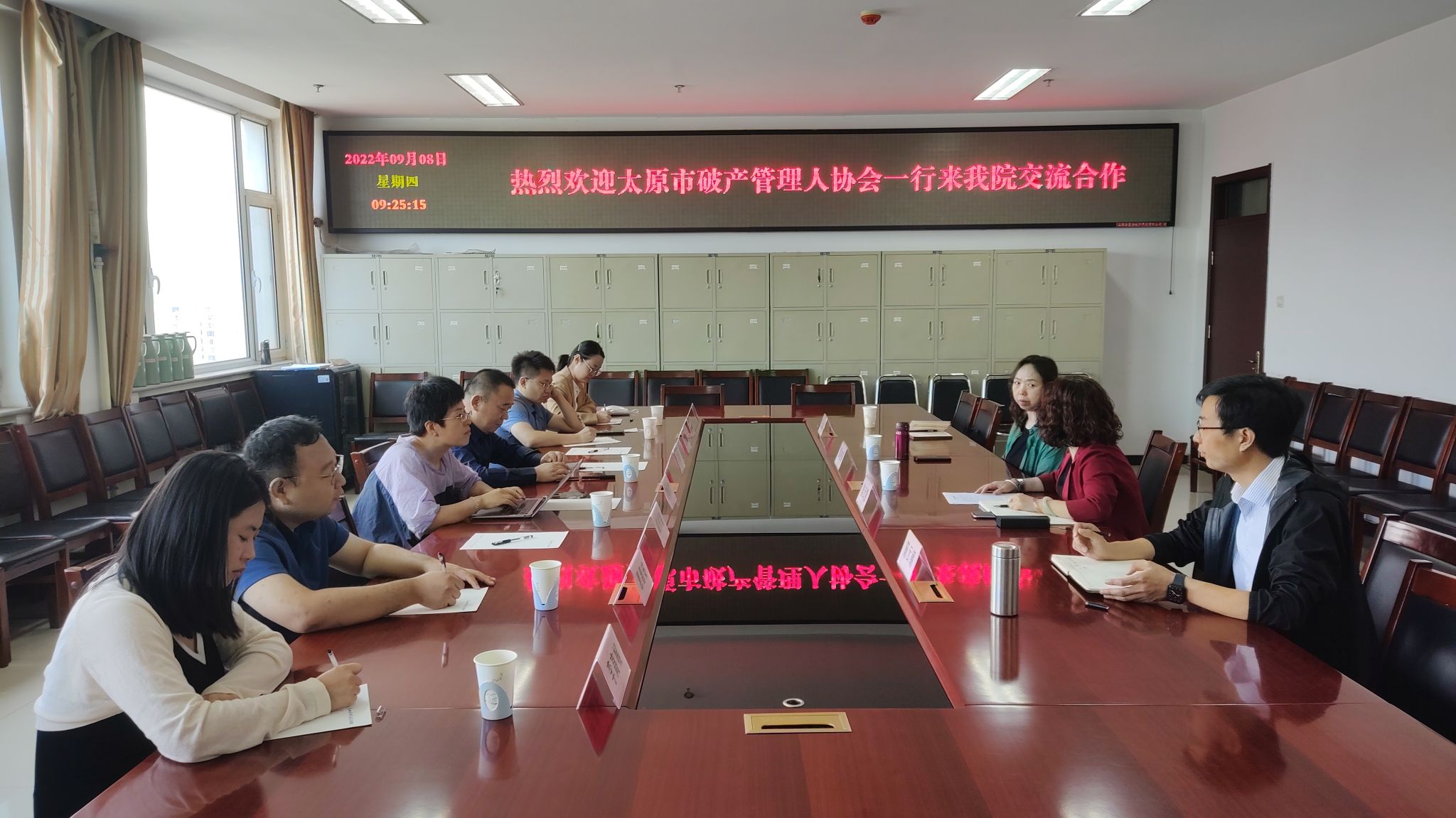 9月8日上午,太原市破产管理人协会一行6人在会长王晓华、秘书长李焕清带领下来厂长资源 进行交流洽谈,樊云慧院长、陈云朝副院长、张旭娟教授、汪丽丽博士参加了会谈。