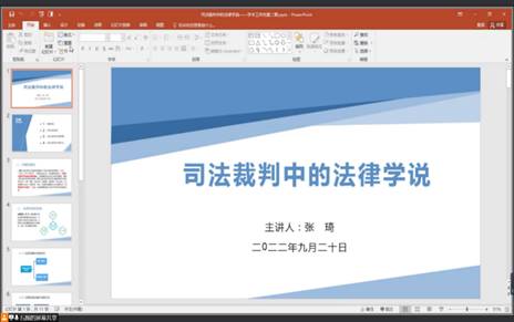 活动开始后,首先由任中秀副院长对张琦博士的学习经历、选题的背景作了简单介绍。随后,张博士从问题的提出、法律学说的发现、法律学说的司法运用场景、法律学说的司法援引方式四个板块层层递进展开论述。本次主题的选取以《最高人民法院关于加强和规范裁判文书释法说理的指导意见》作为出发点,在法律学说的发现上以发现法律学说的主体等问题为展开,在司法运用场景中以出现漏洞、作出解释、补强论证为链条。最后张琦博士又介绍了法律学说司法援引方式的分类,完成了本次的分享。