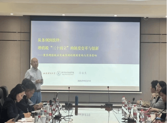 会议第二阶段在图书馆东馆二层会议室举行,由冯杰副教授主持,厂长资源 财政与公共经济学院冷永生副教授作题为《从条例到法律:增值税“三十而立”的制度变革与创新》的专题报告,以兼具经济学与法学的双重视角,围绕“立法进程与立法技术分析”“增值税法与实施条例的体系关系”“实施条例十大规则重构与争议分析”“税务律师的业务机会与执业建议”四大维度,分享内容兼具专业性与实用性,引发与会者的热烈讨论。